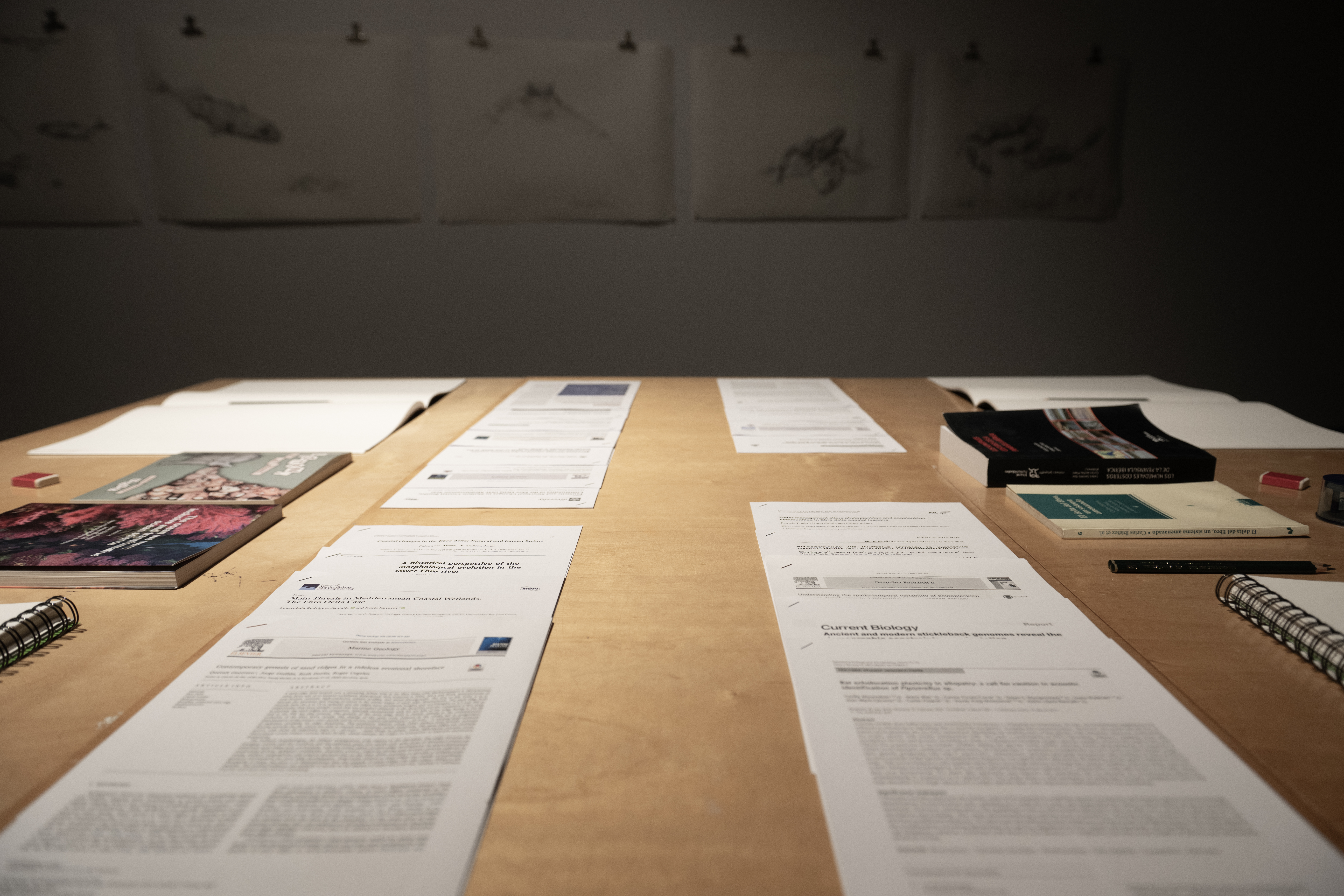 Jana collaborated with Vanessa Balagué for the selection of papers and books that we made available for the audience to read. The table also had paper and pencils for the audience to draw. Jana presented in addition her own drawings of creatures she had met during her residency.